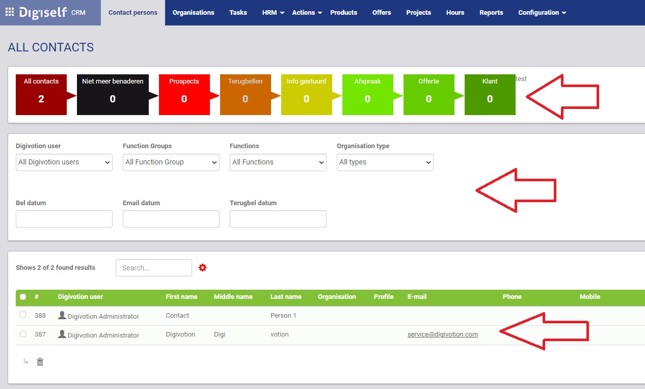 Op de pagina met het overzicht van de contact personen ziet u de werving trechter, filters en een tabel met de contact personen.