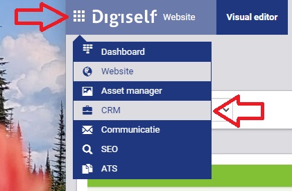 Klik linksboven in uw scherm op het icoon met de 9 puntjes. Een submenu opent, waarin - afhankelijk van uw rol - een link naar het CRM is opgenomen.