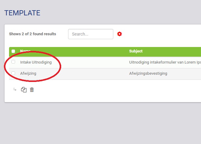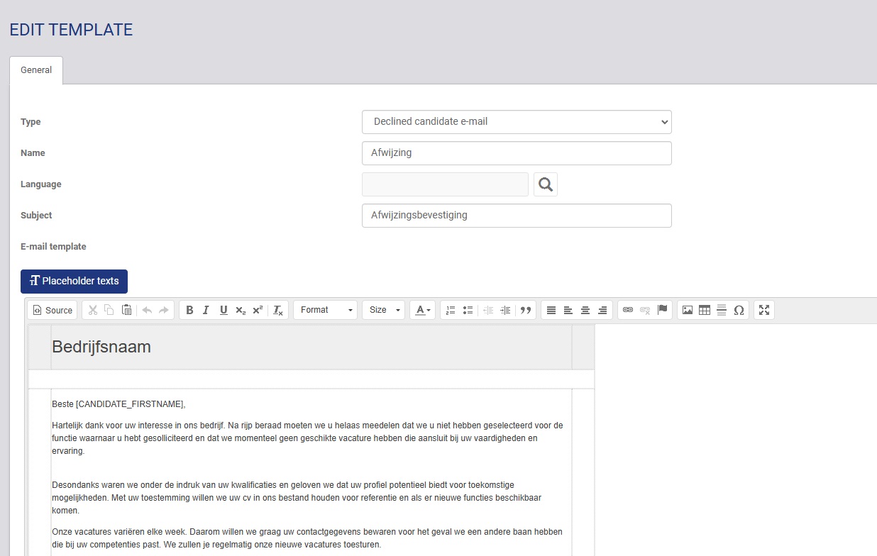 U komt in het overzicht terecht met alle bestaande templates voor bepaalde soort e-mails (bv. afwijzing). U kunt op een template klikken om deze aan te passen.