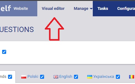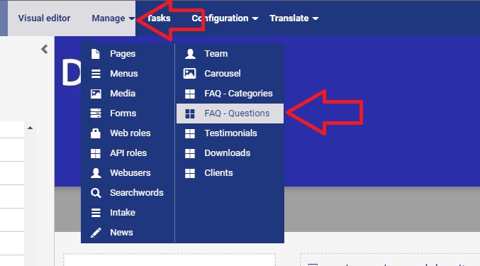 U komt meestal in het Visual Editor terecht. Klik bovenin het menu op Manage > FAQ - Questions.