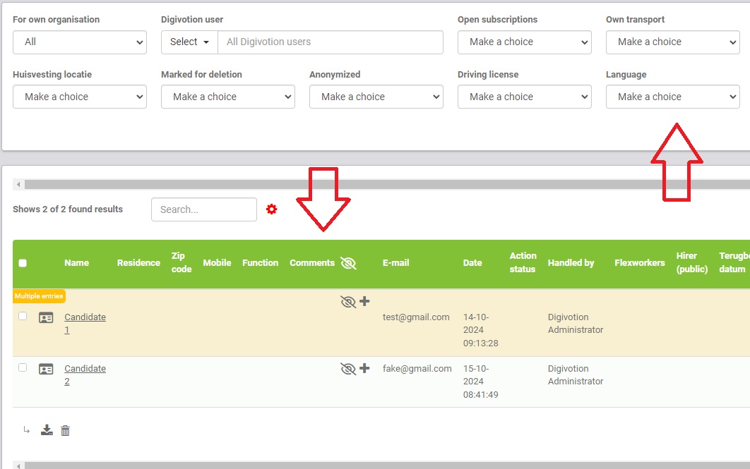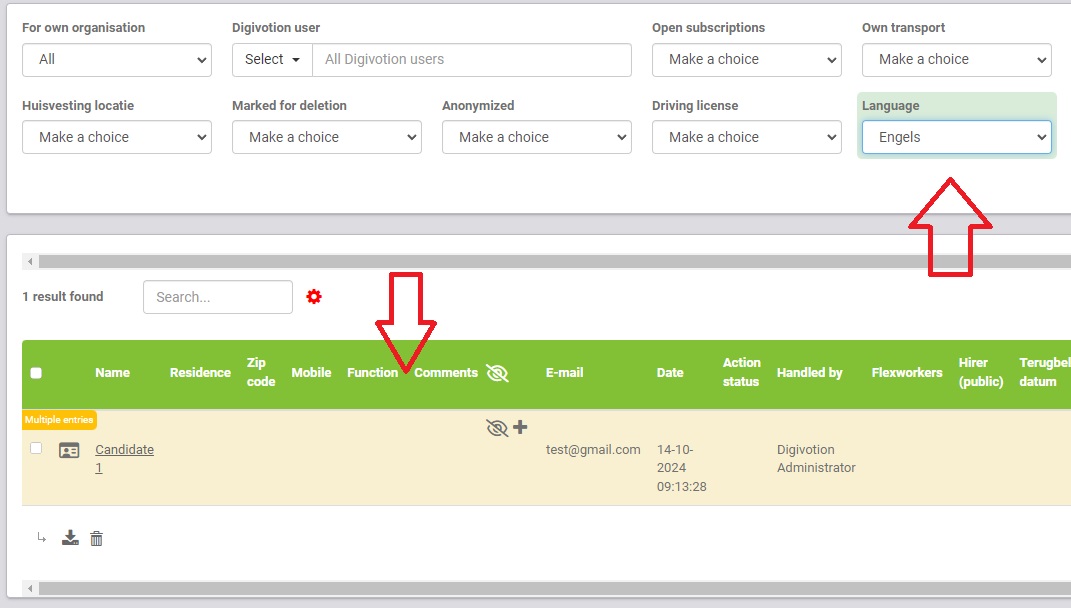 De middelste rij is het filter. Hier kan je op bepaalde eigenschappen van de kandidaten filteren. Als je bijvoorbeeld bij Language de optie 'engels' kiest worden alleen kandidaten die bij Language de optie 'engels' hebben gekozen weergeven.