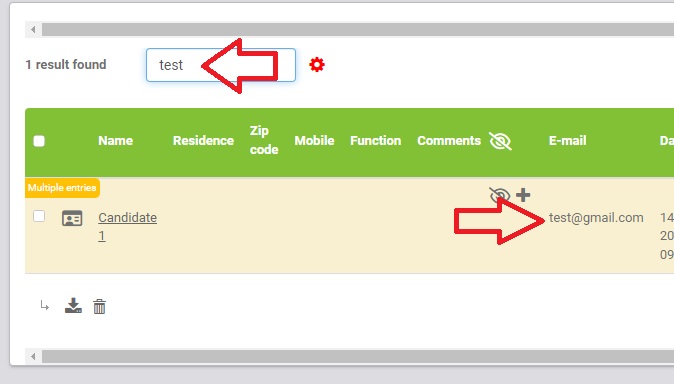 Onderin bij het overzicht tabel vind u een zoekbalk. Hier kunt u eigenschappen van een kandidaat in typen (zoals de naam of e-mail) en dan zoekt het de kandidaten met die eigenschappen op.