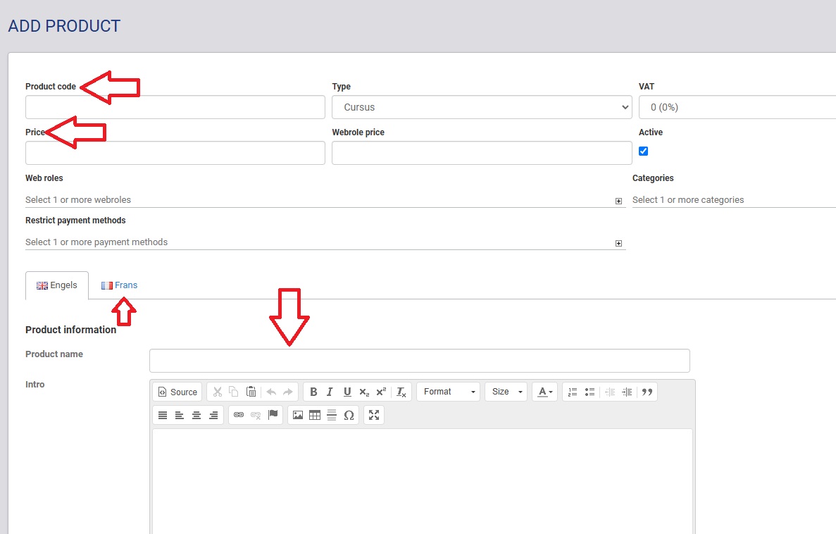 U kunt verschillende velden invullen. Vul minimaal de Product code, Prijs en naam van het product in. De naam van het product moet vertaald worden.