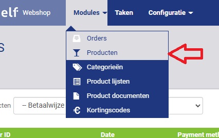 U komt meestal in Modules-Orders. Klik in het hoofdmenu op Manage (of Modules) > Producten.