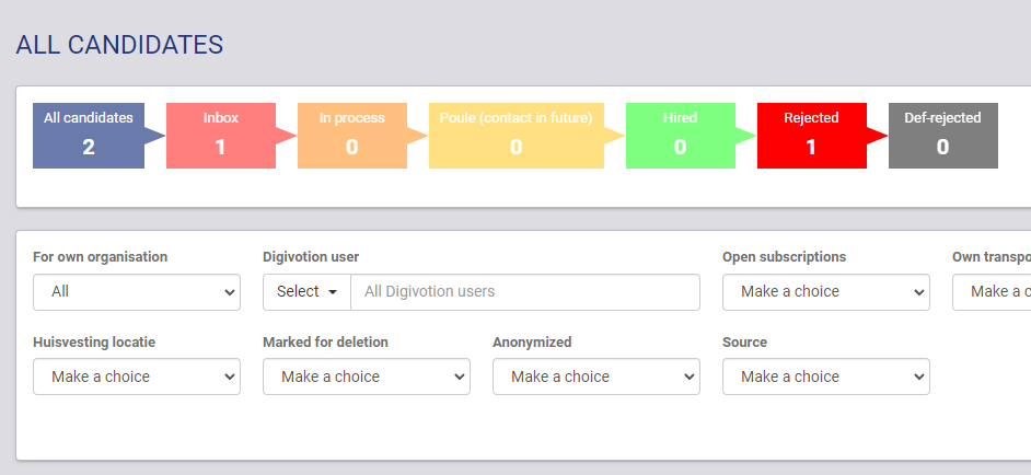 Verschillende kandidaten zitten in verschillende statussen. U kunt ook op 'All candidates' klikken om alle kandidaten te bekijken. Klik op een specifieke funnel om de kandidaten met alleen die status te bekijken.