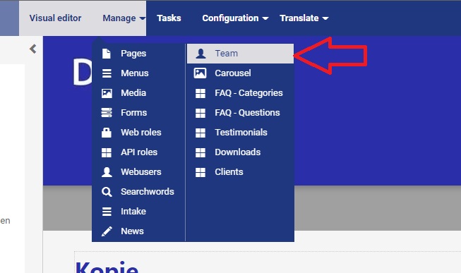 U komt meestal in het Visual Editor terecht. Klik bovenin het menu op Manage > Team.